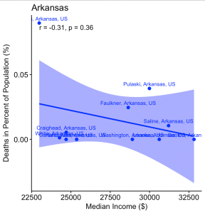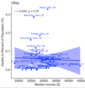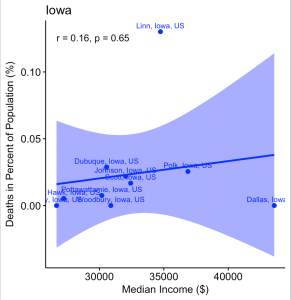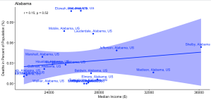 Next, it is obvious that larger populations in larger counties will naturally have more COVID cases, so to mitigate this I worked with the percentage of people for a variable. So the median income and the number of deaths was divided by the population N and then multiplied by 100% to get the percentage.