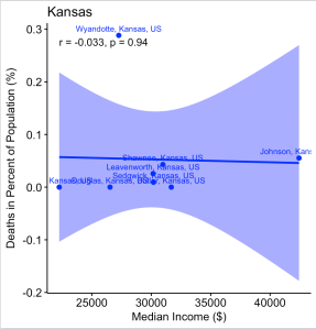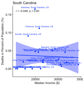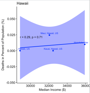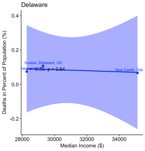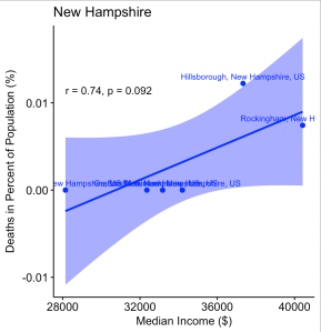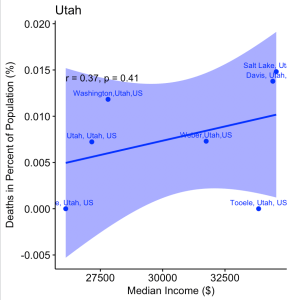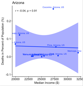 Looking at these correlations was interesting. Some states, I noted, at least Illinois, California, and New York which have populous cities and are very democratic, had positive, significant correlations. Other states did not, notably some Republican states such as Florida and Arizona. These casual correlations had me wondering about political affiliation. Given that the current situation has the country very politically divided, perhaps one’s political affiliation (at least at the state level) would play a part in the number of COVID cases as it relates to Income.